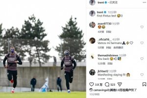 皇马后卫阿诺德更新社媒,晒出训练图:首次感受平图斯的训练强度😅。