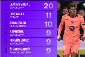 体育资讯02月05日讯 本赛季西甲截止至今,据Squawka统计,亚马尔在多项数据霸榜。