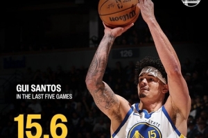 体育资讯2月9日讯 勇士官推今天晒图分享了一组桑托斯近5场比赛打出的数据:场均15.6分,运动战命中率68.2%。