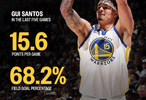 直播吧2月9日讯 勇士官推今天晒图分享了一组桑托斯近5场比赛打出的数据:场均15.6分,运动战命中率68.2%。