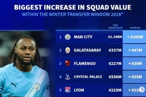 体育资讯2月10日讯 各大联赛冬季转会窗基本都已关闭,《转会市场》也统计了经历这个冬窗之后的球队身价上涨最多情况,曼城无悬念居首。