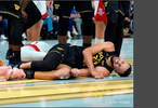 在火箭战中与对手接触并倒在球场上的库里
