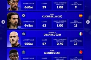 库库雷利亚(切尔西,27岁,西班牙):身价4500万欧,62场,场均丢1.00球,直接参与11球
