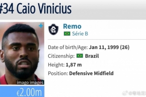 卡约现年26岁,在场上司职后腰,效力于巴乙瑞模贝雷,上赛季共出战了28场巴乙联赛,打进5球助攻2次,目前德转身价为200万欧。