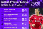 此外在参与至少25次空中对抗的球员中,范戴克的成功率最高,达到了80%。