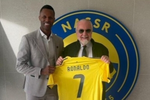 那不勒斯主席德劳伦蒂斯手持C罗球衣,与利雅得胜利CEO合影