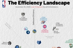 体育资讯12月27日讯 今天,美媒Kirk Goldsberry晒图统计了NBA过去10场比赛所有球队的攻防效率,详情入下: