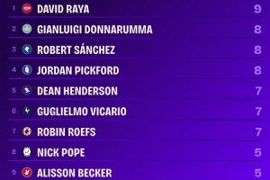 本赛季英超零封榜:拉亚9次位列第一,多纳鲁马、桑切斯8次