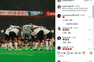 利物浦队长范戴克社媒晒出比赛照片,配文:“我们是团队,是朋友,但最重要的是,我们是一家人。”