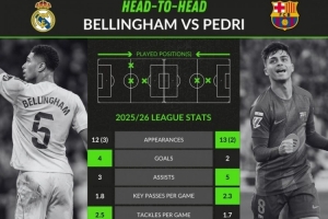 本赛季西甲关键数据对比:贝林15场4球3助攻,佩德里15场2球5助攻