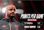 拜仁慕尼黑官方在今天发布了孔帕尼的数据海报,表示孔帕尼已经追平了瓜迪奥拉,成为德甲历史上场均获得积分最高的主教练之一。