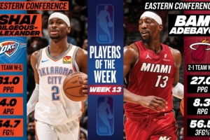 体育资讯1月20日讯 今日NBA官方宣布,雷霆球星亚历山大和热火球星阿德巴约分别被评为本赛季第13周西部和东部周最佳球员。