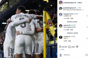 本场比赛贝林厄姆首发打满全场,他也在个人社媒晒出本场与队友庆祝进球合照,配文写道:“一步一个脚印,又拿下一场重要胜利!”