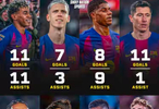 本赛季巴萨队内多达8人达成参与进球上双的成就,进攻火力分布极为均衡: